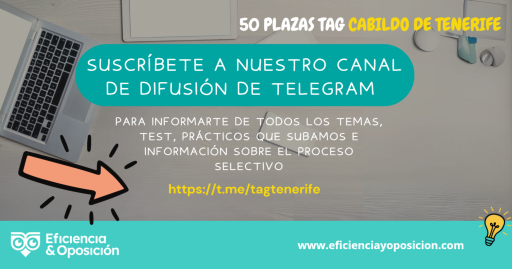 Suscríbete a nuestro canal exclusivo para este proceso selectivo de Telegram. Informaremos en él cuando subamos nuevos temas, suscripciones test, casos prácticos o cualquier novedad sobre el proceso selectivo, o bien, escríbenos al WhatsApp al 644972862 y pídenos que te incluyamos en la lista de difusión de TAG Cabildo de Tenerife
